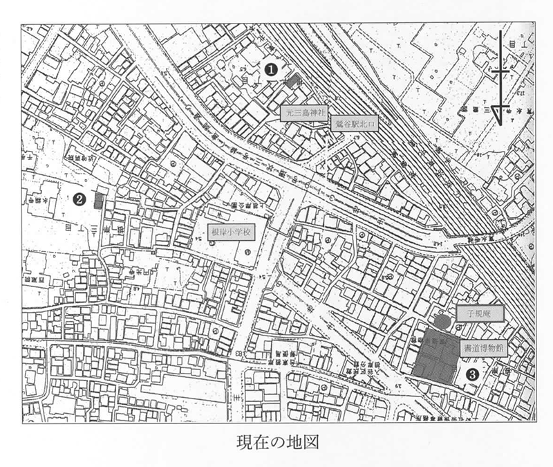 Although I am not knowledgeable about Negishi, Fumihiko Otsuki, a famous linguist of Japanese who lived in Negishi (an editor of "Genkai"), made "Tokyo Shitaya Negishi oyobi Kinbono-zu," a map of Shitaya, Negishi and their nearby areas, in 1901. He said that although this area had lost its charm because a railway was constructed, meandering narrow lanes were left as they were. There are still temples, bathhouses, barbershops, soba restaurants, fish shops, and paddy fields in the map. I was pleased to find Motomishima Shrine, Negishi Elementary School, and Sasa no Yuki in the map. It is said that there were houses and second-houses of writers and artists in the areas. Ritsu said, "The grounds of the Kaga family became a subdivision land, and handsome houses were built around here" when asked by Hekigoto in 1933. I have a mind to hear how Negishi has been transformed after an air raid in 1945 from people who know that, and record it in a document.