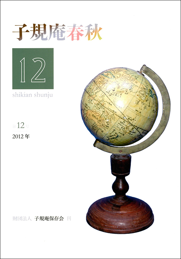 子規庵保存会では、『子規庵春秋』を発刊しています。子規庵春秋の表紙には、子規が愛用した品々が取り上げられています。子規は、小振りの地球儀を見ながら、その思いは世界を駆け巡っていたのでしょうか。(『子規庵春秋』第12号、2012)