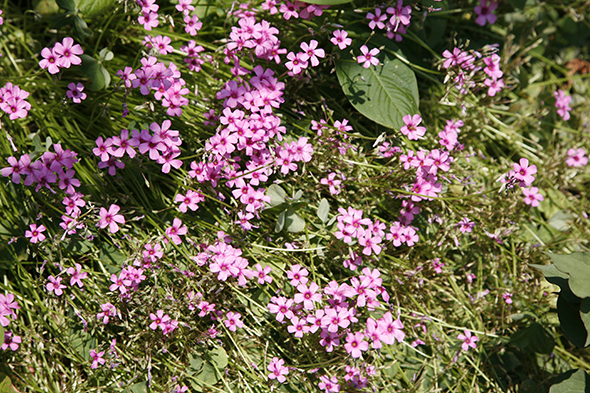 子規庵の庭には、妹の律や友人が病床の子規を慰めるために様々な草木を植えました。「小園の記」には小園の図があり、俳句で草木がその場所場所に示されています。椎、竹、松、萩、芒、鶏頭、桔梗、朝顔、秋海棠、おしろい花、葉鶏頭、百日草です。松葉牡丹は別名の日照草(ひでりそう)と両方登場しています。子規の好きな薔薇や、子規庵の象徴のような糸瓜はこの頃まだ無く、糸瓜棚は34年に作られました。