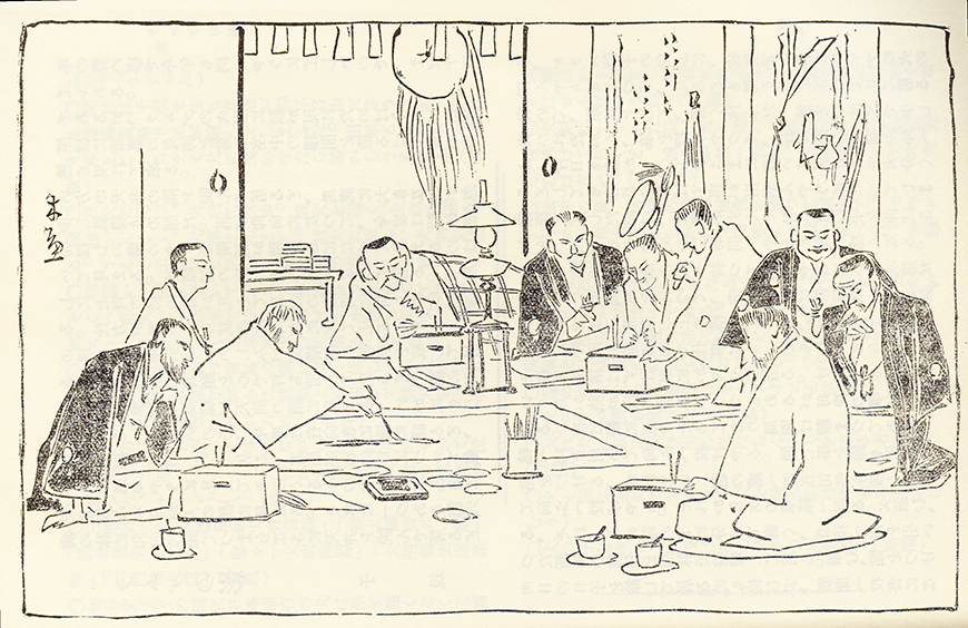 「子規庵句会写生図」画・下村為山 賛・河東碧梧桐 (昭和10年(1935)、子規庵寄託資料)