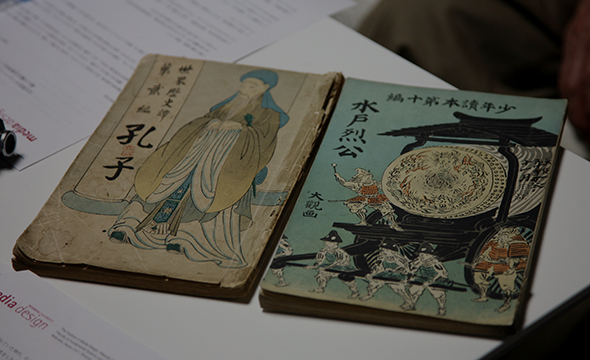 Since he taught at the design department for the first time, he studied design, and created cover art and illustrations for books. I think this brought positive effects to composition of his paintings. Other professors, including Shunso Hishida, also created illustrations. This is a book on Rekko Mito published by Hakubunkan. Yokoyama was born in Mito, and his father and grandfather were clansmen of the Mito clan and engaged in drawing maps.