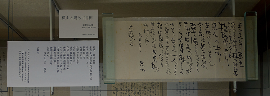 A letter from Tenshin Okakura whom Yokoyama looked up to as his lifelong teacher. Okakura celebrated Yokoyama's second marriage with Naoko Endo in 1906 in the letter. Although Yokoyama got remarried to Naoko in 1903 after his first wife, Fumiko, died, Naoko also died in 1913.