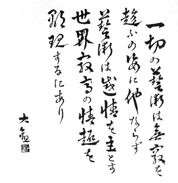 다이칸은 오카쿠라 텐신이 남긴 ‘일체의 예술은 무궁(영원)을 좇는 것이다. 예술이란 감정을 토대로 세계 최고의 정취를 표현하는 것이다’라는 말을 좌우명으로 삼아 많은 명작을 남겼습니다. (요코야마 다이칸 기념관 ‘다이칸의 말’ 발췌)
