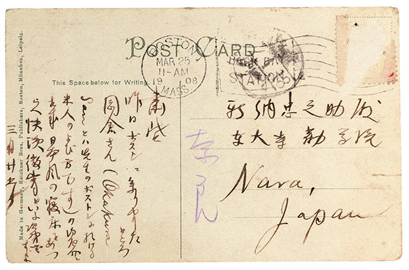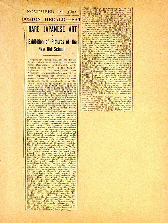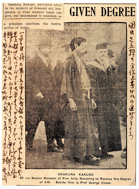 从哈佛大学寄来的天心出席文学修士“Masters of Arts”学位授予式时的新闻报道,新闻报道的左右空白上的字是天心的弟由三郎写的。