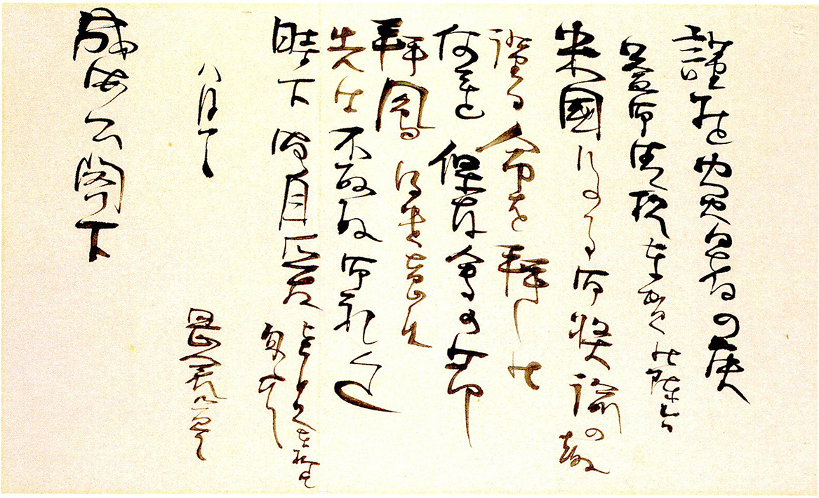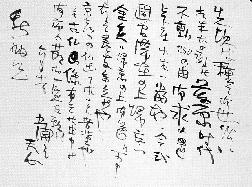 In this letter, Tenshin thanked Takamura for her hospitality, and asked Ni-iro to go to Toyama. Tenshin wrote "Tokyo Yanaka, the Japan Art Institute, Kakuzo Okakura" on the back of the envelope.