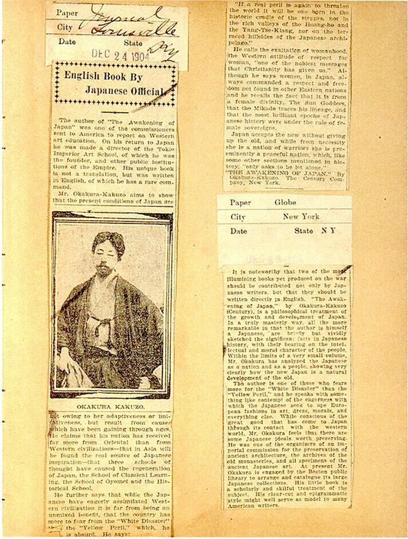 텐신과 함께 미국으로 건너간 다이칸, 슌소는 미국 각지와 유럽을 돌며 전시회를 개최했습니다. 이러한 활동을 전하는 신문기사를 수집한 신문기사 절취첩은 표지를 포함해 52페이지로 구성되어 있습니다. 텐신의 미국 체류기간 동안 출판한 「The Awakening of Japan」나 신문 논설 「Japan and the 'Yellow Peril'」등의 귀중한 자료가 포함되어 있습니다.