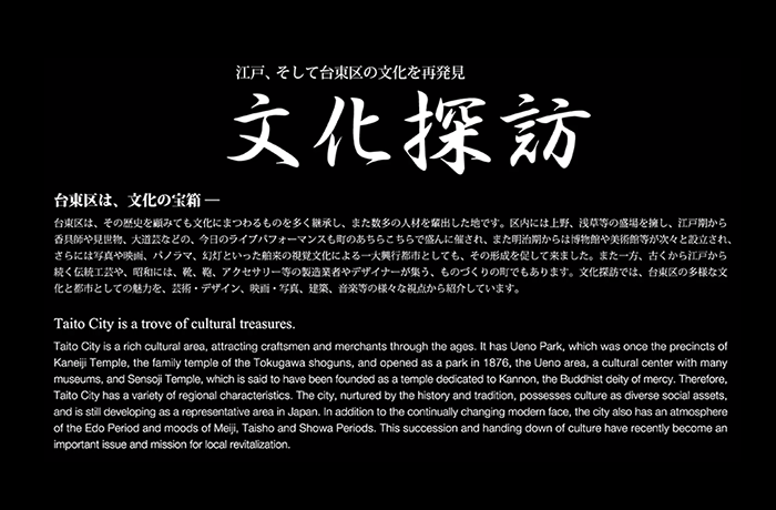 Topics 台東區文化特輯 舊東京音樂學校奏樂堂 在舊東京音樂學校奏樂堂裡,感受到明治時代的氣息。 上野公園巡遊 在上野之森的土地上,至今仍然沉睡著為數眾多的歷史印記。 清水觀音堂的月之松 廣重曾經也是透過月之松來看這道風景的吧。 上野下公寓樓的歷史 上野下公寓是在1923年(大正12年)9月1日,由財團法人同潤會建設的集合住宅樓之一(譯註:同潤會負責建設的集合住宅都被稱為同潤會住宅) 。 文化探訪展2017 展覽視頻已經發布。