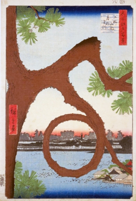 歌川广重是江户时代末期的浮世绘师,为后世留下了《东海道五十三次》和《六十余州名所图会》以及《名所江户百景》等数量丰富的风景画。其中《名所江户百景》是广重最晚期的作品,因为巧妙地运用了俯瞰和鸟瞰等视点和构图方法被后世广为称道,成为其深具代表性的作品之一。尤其是他对蓝色的巧妙运用,画面意境清雅独特,被称为广重蓝受到世人的高度评价。