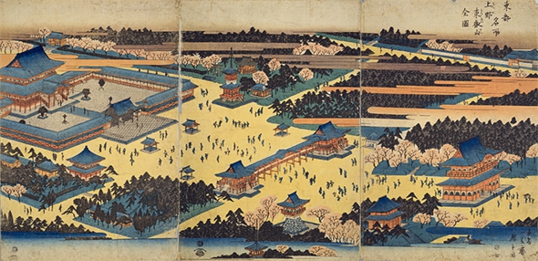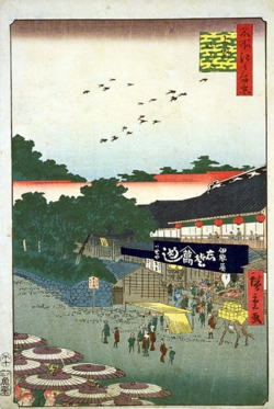 歌川広重は、江戸百景の一枚として「上野山した」と題して、当時の東叡山寛永寺門前の賑わいを描いています。飯屋伊勢屋の店内の賑わいが見えます。寛永寺への参拝帰りの客でしょうか。伊勢屋の隣には五條天神の鳥居が見えます。