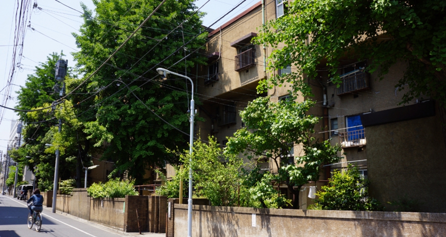 우에노시타 아파트는 도쿄메트로 긴자센 이나리초역 근처 清洲橋길에 접하고있습니다.이 파트만 쇼와 초기의 시대에 머무르고 있는 듯한 정취를 자아내고 있습니다. 4층아파트에 4층부분이 처마처럼 되어 있습니다. 1층이 상점인 1호관과 주택으로 구성되어진 2호관으로 2동으로 되어 있습니다. 앞마당에는 샘터와 우물용 펌프가 있어 아파트주민들이 우물가에서 담소하는 소리가 들려오는 것 같습니다.